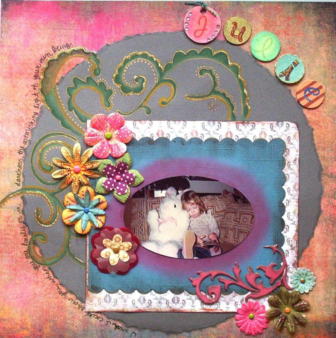 This is a picture of me when I was about 4 years old. I didn't remember this but my Mom told me I named the rabbit "Dr. Moretto" after my doctor at the time...strange! The journaling is a quote and reads: "I wish I could show you, when you are lonely or in darkness, the astonishing light of your own being". I've been through some very challenging things in the past couple years and in overcoming those challenges, I was surprised at my own strength. This LO is meant as a reminder to myself that I am capable.
