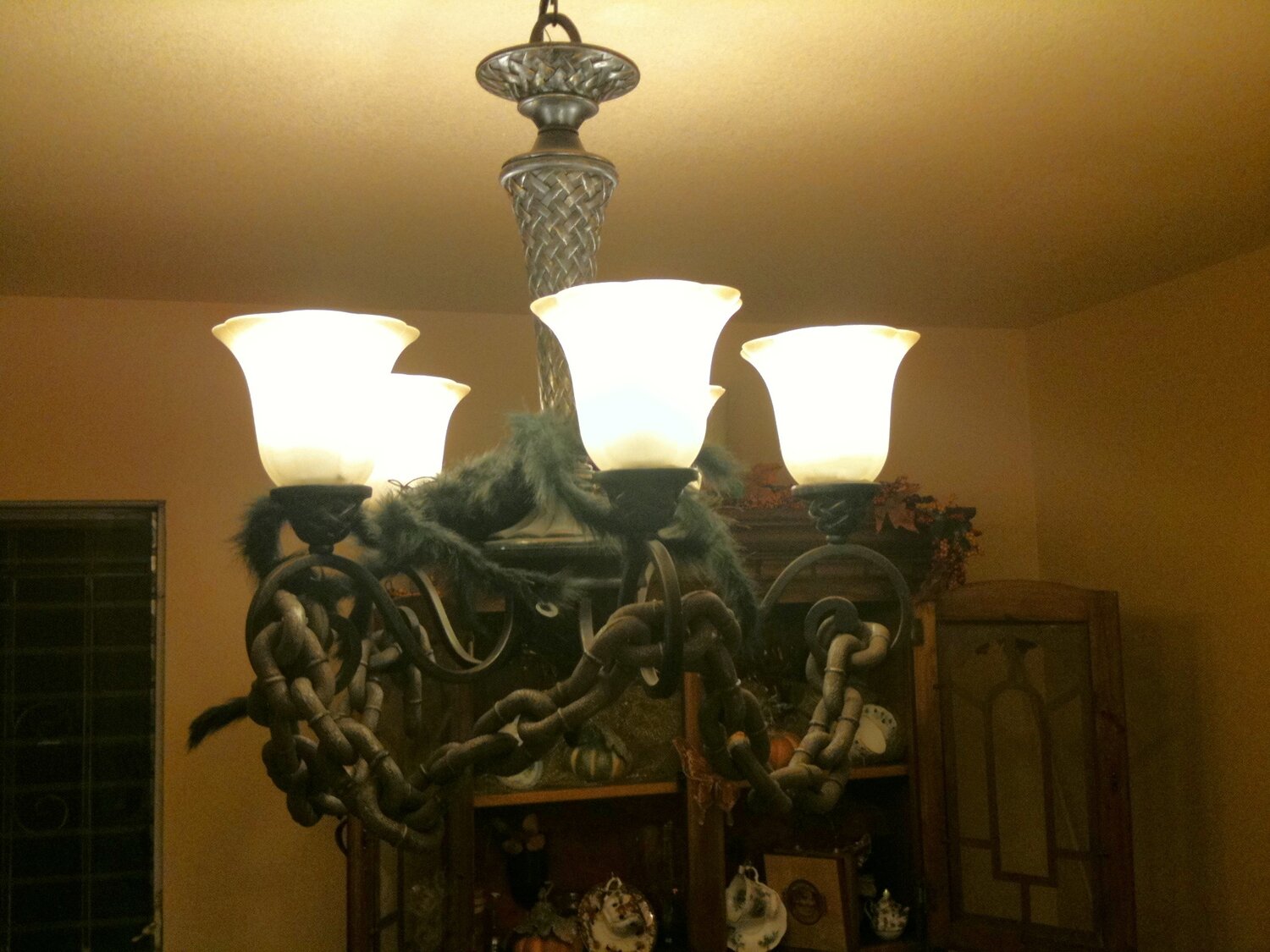 I decided to creep my Halloween guest with this huge hairy spider and chains in my dinning room chandelier! TFL!