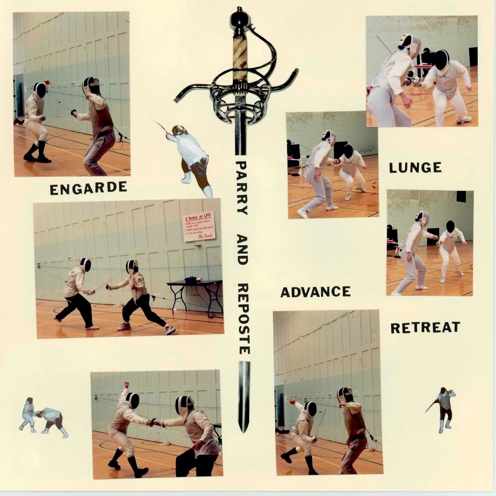 I started to scrap my husband's events for him. These took place before I met him. It was also my first use of my Sizzix Fruit Smoothie font. The small scattered fencers are cut carefully out of unused pictures. I was happy with how it came out. I like the uncluttered look.