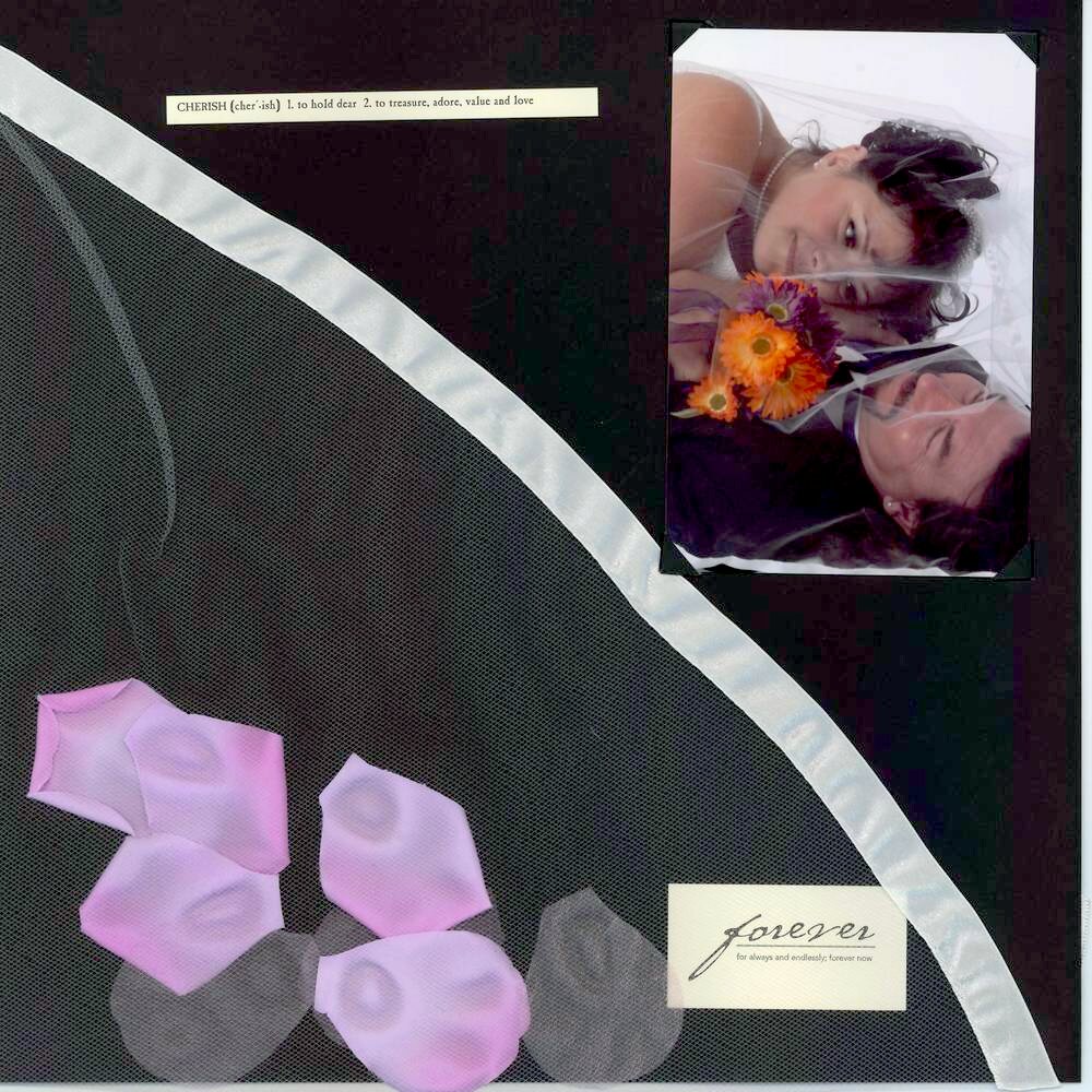 Oh man...I could NEVER cut up my veil like that...but what a great idea. I LOVE the purple flowers beneath it. Simplistic and classy :) I am going to start my wedding album when I get better at scrapbooking and have all of the tools I want...I hope you don't mind if I steal some of your ideas :)