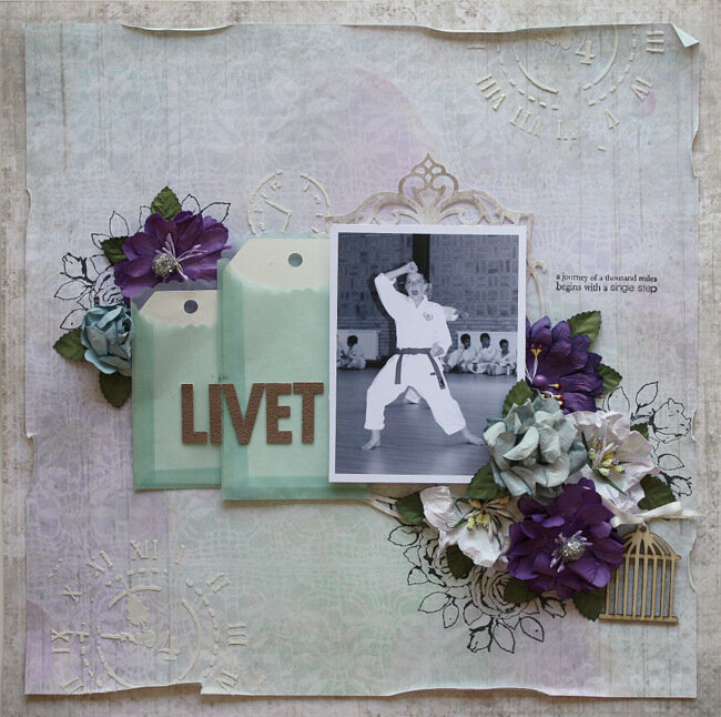 Using the Sept kit from C'est Magnifique Kits for a layout about my son who is into karate. The quote is a stamp and says: "a journey of a thousand miles begins with a single step." Through karate my son will learn how to gradually grow as a person learning self-control and self-esteem.