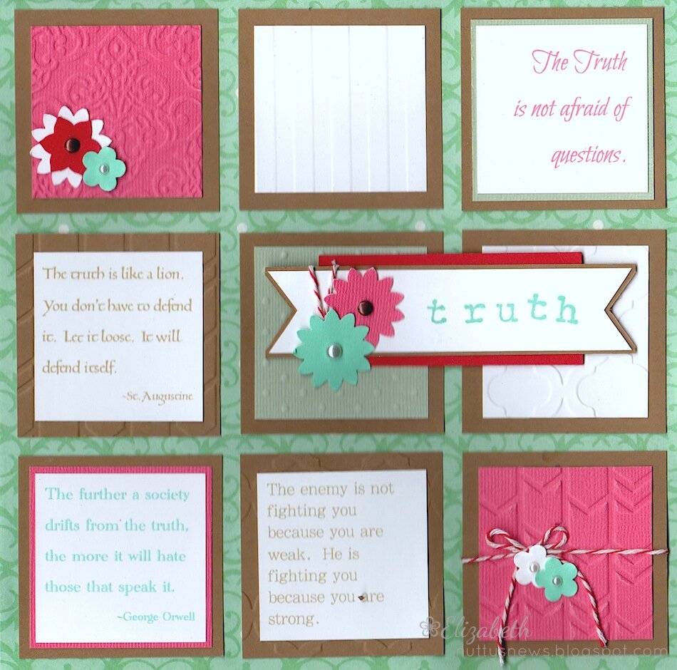 Love this layout. The design is great and the quotes are fabulous. Also love the embossing the twin, the colors, the flowers, everything. Going into my favorites. Thanks for entering this challenge. Hope to see you in March.