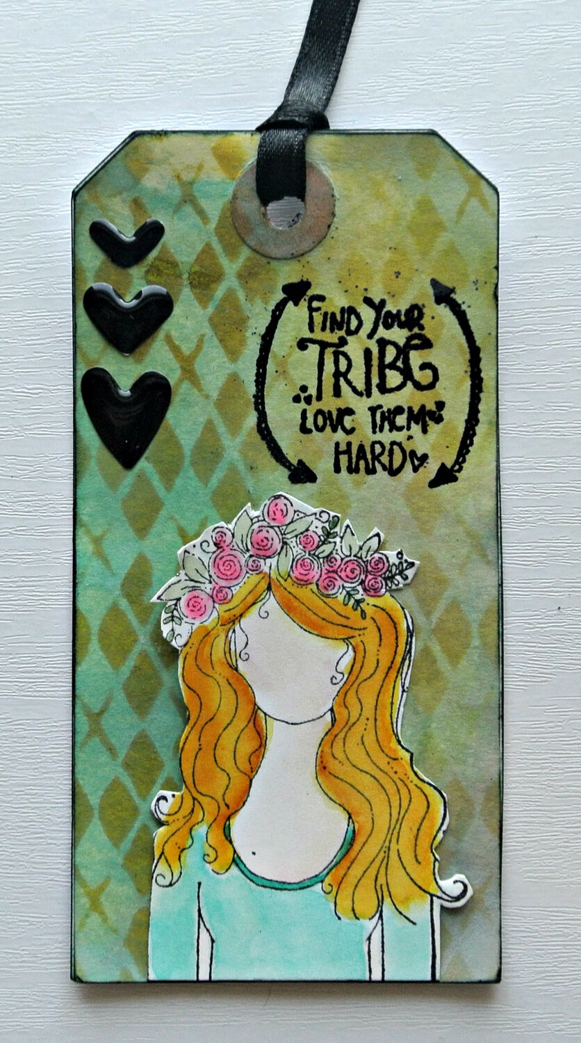 Tag made with Unity Stamps planner girls. Background is Tim Holtz oxides and Tim Holtz stencil with distress inks on top.Colored with zigs