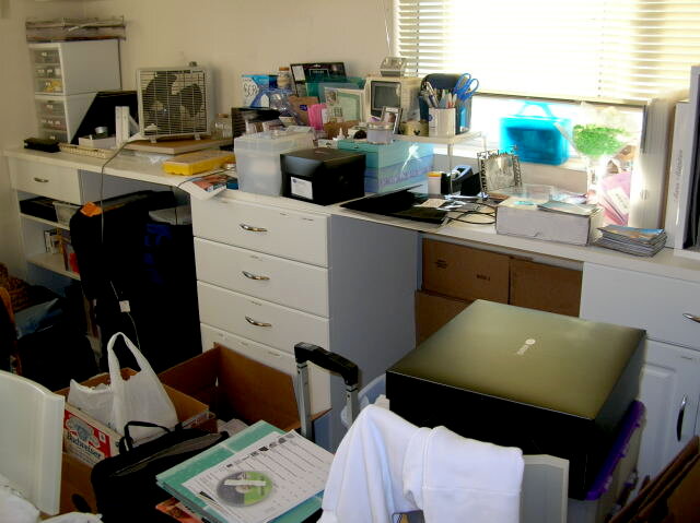 This is supposed to be my workspace... but as you can see... there's no space! My goal is to get things up off the space and on the wall, in the cabinets, on shelves, in a different place besides on my workspace. :)