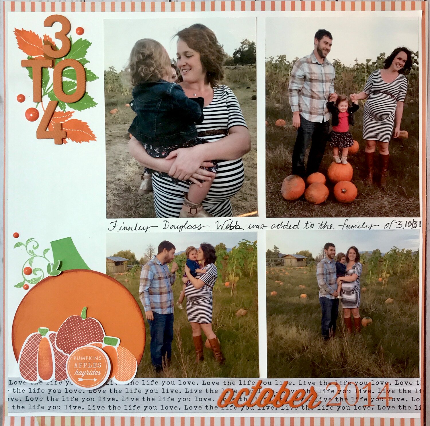 Pumpkin patch, pregnancy photos of son & DIL with granddaughter and soon to be Halloween baby Finnley :). Leaf & pumpkin stamps are Papertrey Ink, the large pumpkin, I hand drew and inked around the edges. 'October' die is layered, from Papertrey ink.
