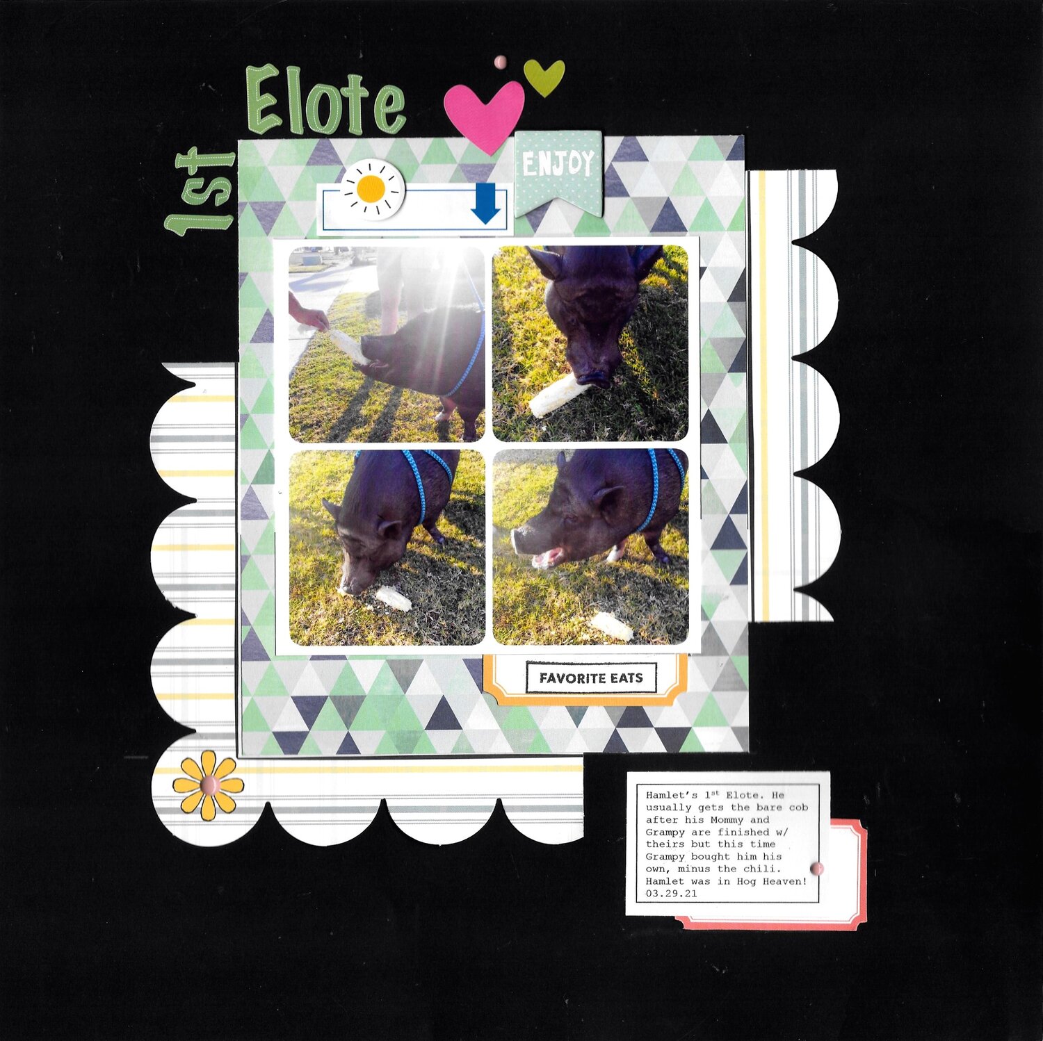 "Hamlet's 1st Elote. He usually gets the bare cob after his Mommy and Grampy are finished w/ theirs but this time Grampy bought him his own, minus the chili. Hamlet was in Hog Heaven! 03.29.21"