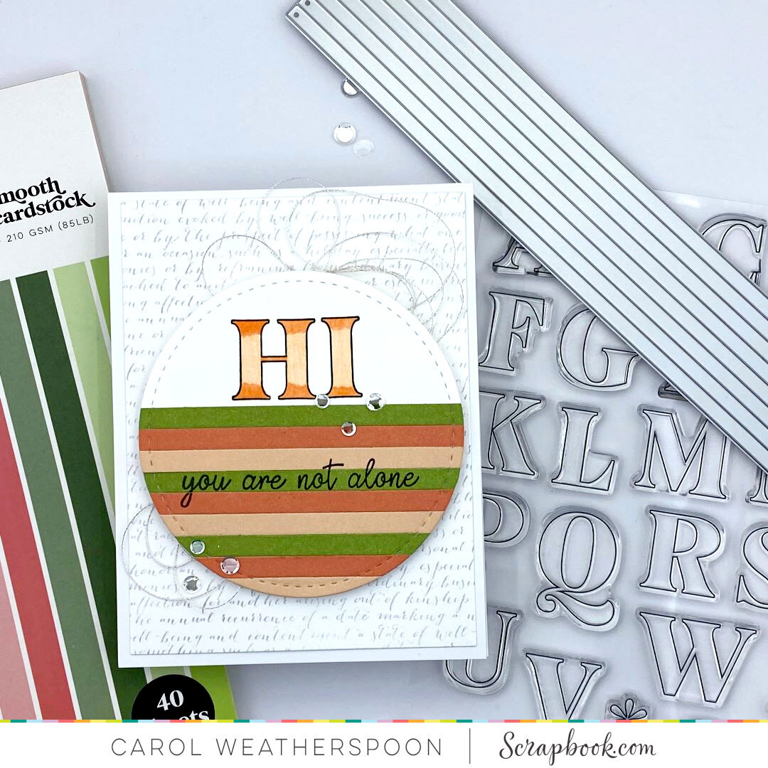 I used the slim strips die and slimline paper pad to cut some strips of paper. I cut that out with a circle die and stamped the word Hi on the top and colored in the letters. I also added a sub-sentiment in the middle of the circle. For my background I used a cling stamp with fancy writing and added a little silver twine behind the circle die cut for added interest.