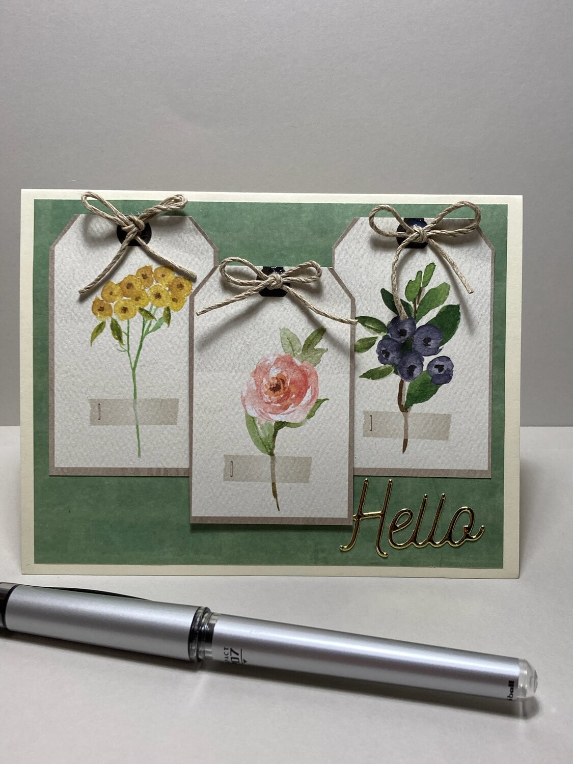 Tags were cut from Carta Bella Spring Market pattern paper with the middle tag slightly popped up with foam tape.