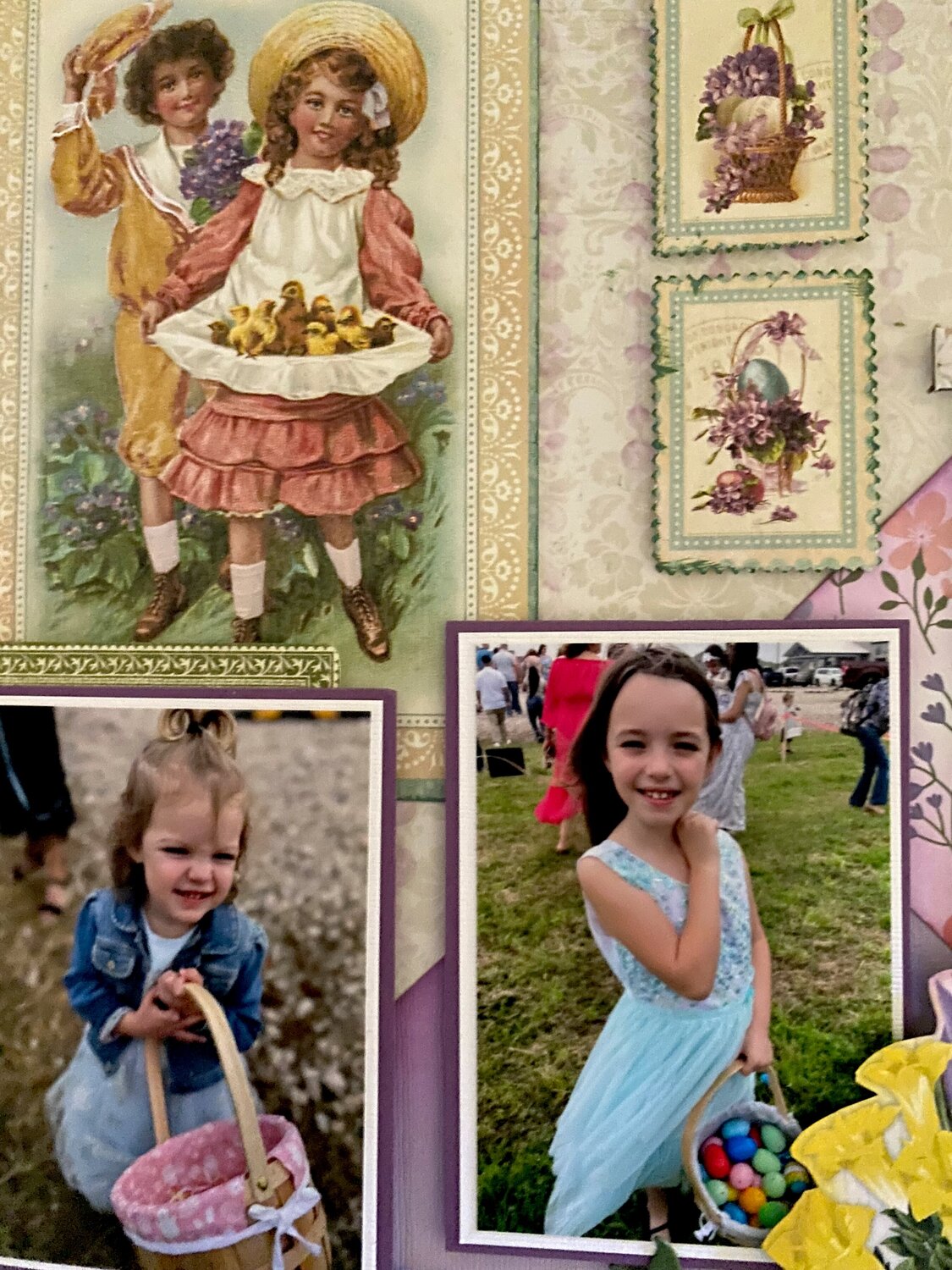 Using Bo-Bunnys Cottontale Easter paper and Ephemera, Catherine Pooler lavender ink pad for extra emphasis around the paper, the Elegant Ivy die set, stickers from the Cottontail sticker sheet, chipboard stickers from Prima were used to create this two page layout. I had fun capturing my daughter and her family. They live in Texas and she sends me pictures all the time!