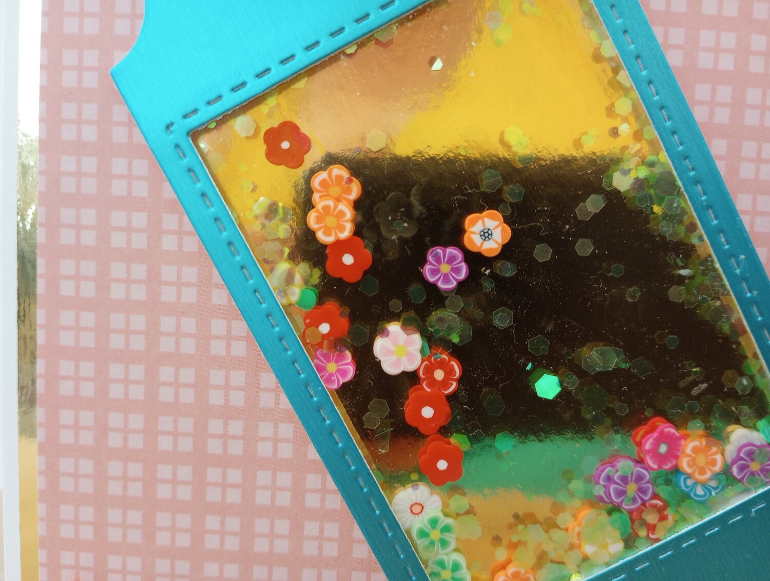 6.5x5 inch card made with white cardstock, matted with gold mirror card, pink plaid paper from Spellbinders. The shaker is made with a Thank You die set from SP. Pops of Color in yellow, orange and dark pink/ruby. The shaker flowers are from Everett Rd. I also added some SBC Shimmer flakes in green. I really like the different sizes of shimmer flakes. The shaker itself is backed with gold mirror card, the front with a blue shimmer card and a dark pink ribbon.
