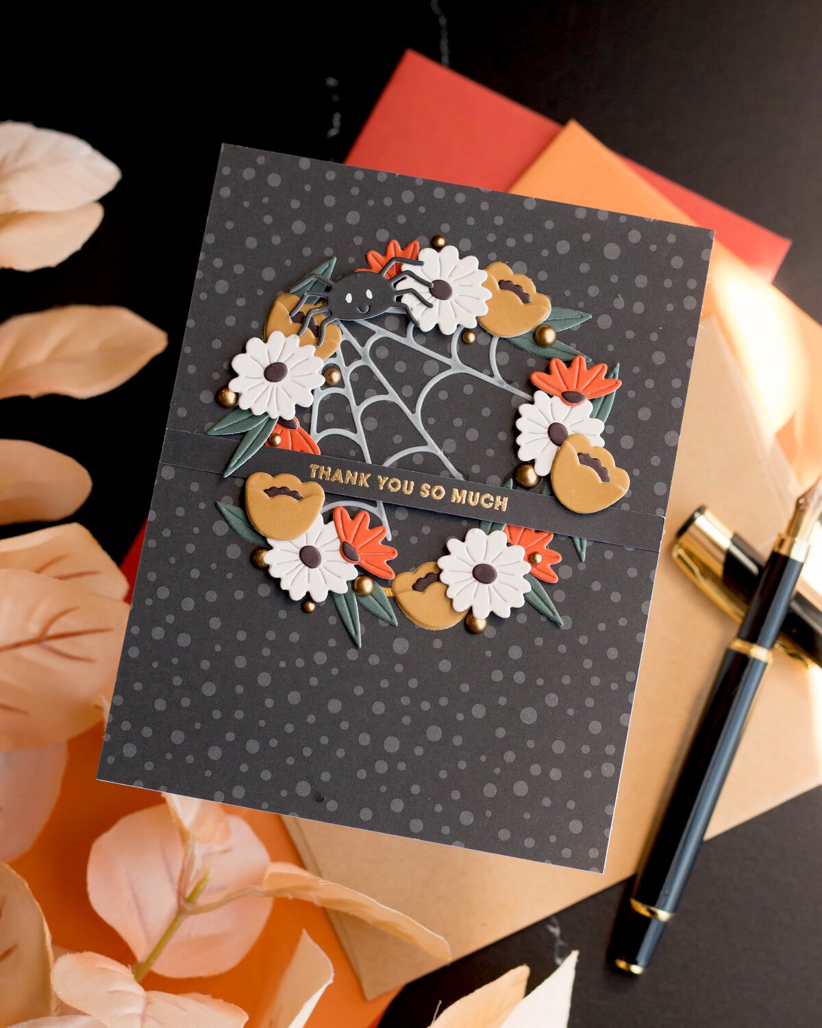 Created this fun card using the Spider Web set and the Mini Flowers. Create a wreath with the flowers, and then layer the spider and its web on it!