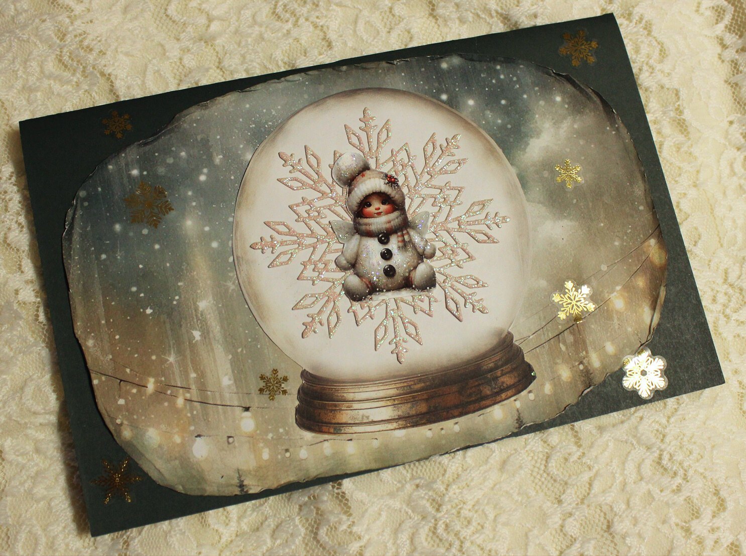 This picture makes this look background look gray but it was actually bluer. I diecut the Tim Holtz snowflake in glitter paper and put the sweet little fairy (from Debbie) in the snowglobe that I fussy cut from Maremi's book. I used my fingertips to fold up the edges of the background that I cut out. I also inked up the edges with TH Iced Spruce then added some snowflake stickers from HL.