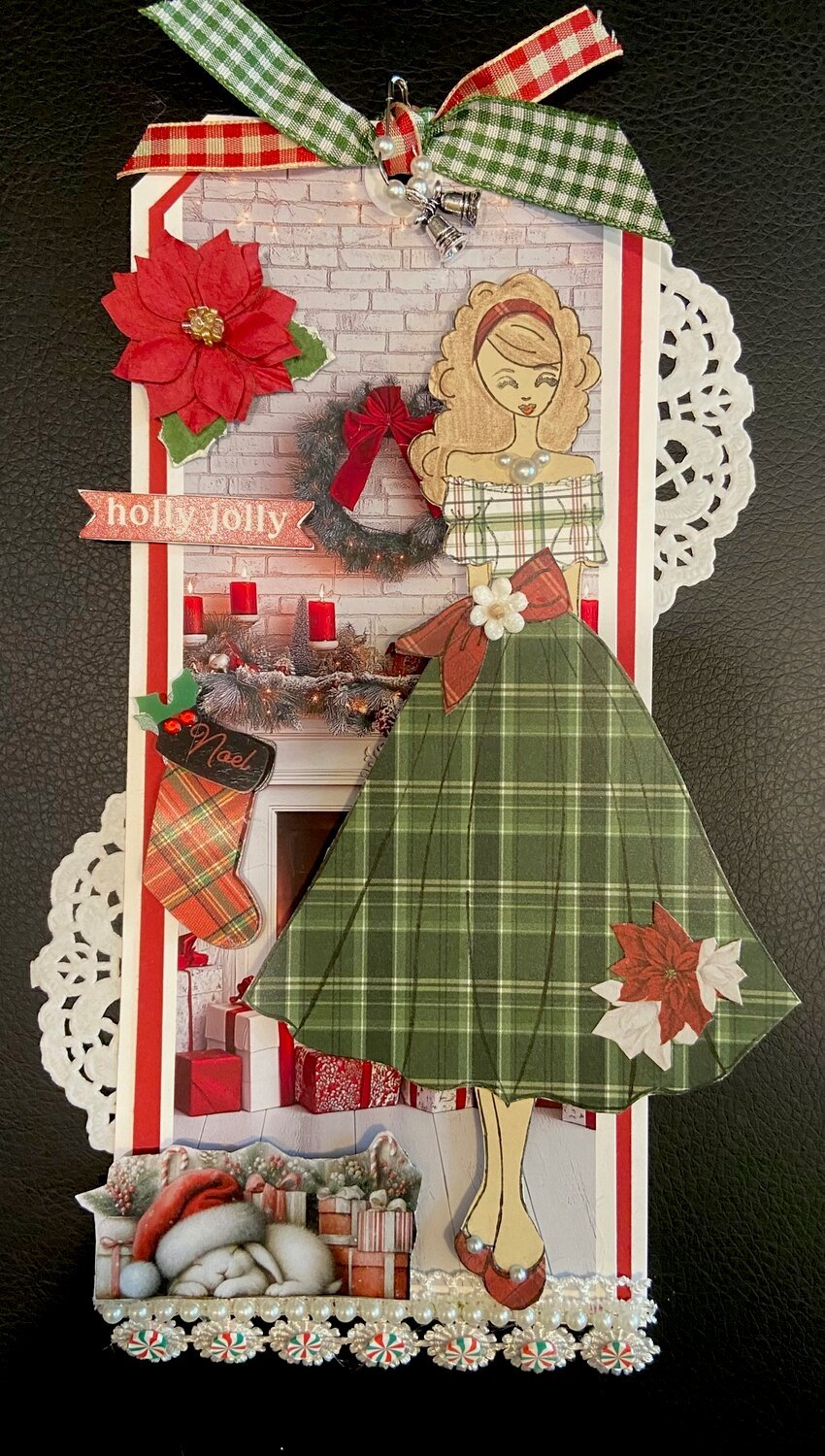 Julie Nutting doll Melissa and a sleepy bunny in front of the fire.