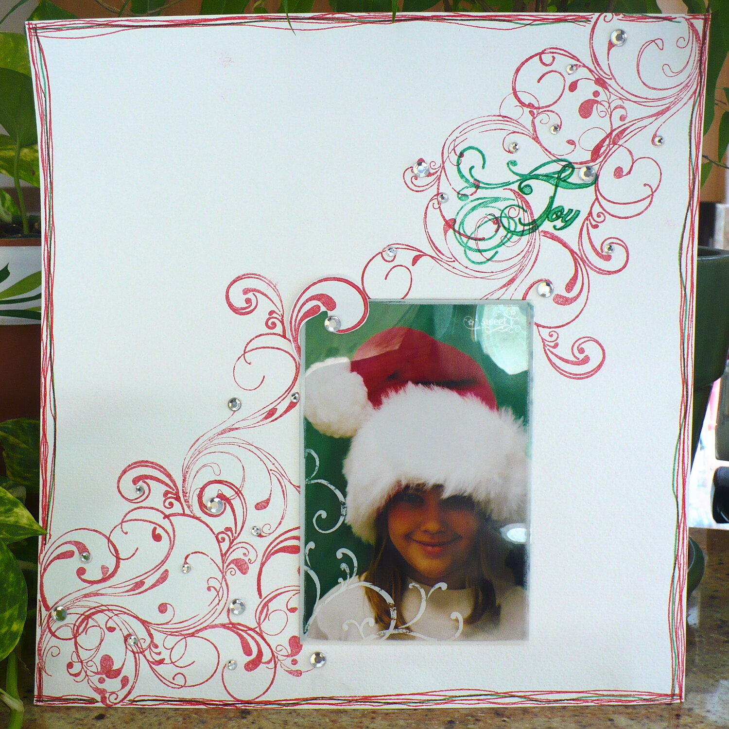 I love this pic of my dd (#3). It was taken when she was 5 (she's 14 almost 15 now). I started with plain white cardstock and stamped the swirls on, I added bling and an overlay and just drew lines for the border. I wanted to keep her sweet face the focus :o)