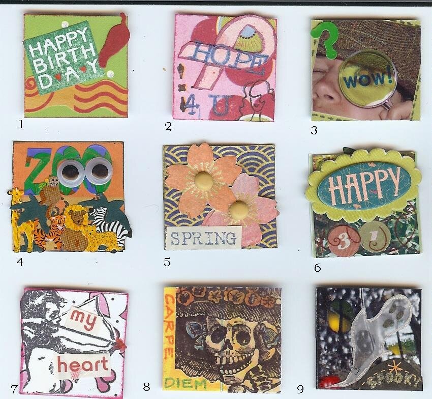 OMG! I have found a new obsession! These are 1"x1" squares called inchies. They're sort of like ATC offspring. I used nothing but scraps, and each inchie is inspired by either a lo I've done, a card I've made, or a member of one of my groups. I've rediscovered the creative worth of my small stamps and punches, as well as stuff from my stash that I've ignored for a long time. The downside is now I'll never be able to recycle the tiniest scrap. A little does go a very long way with inchies. I'll have to get a square punch that will speed up the process, and feed my new addiction.