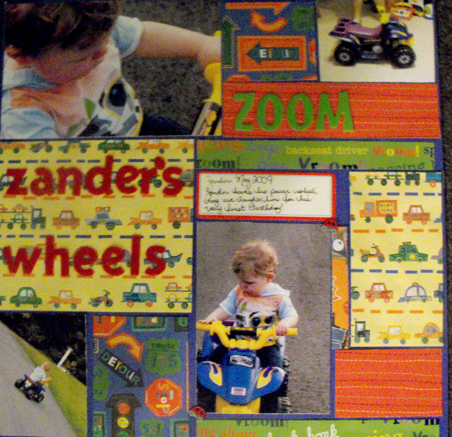 Zander on his birthday gift. I used happy wheels paper for this and blocked out different pics. I also use some journaling strips that I found at the dollar section of Target.