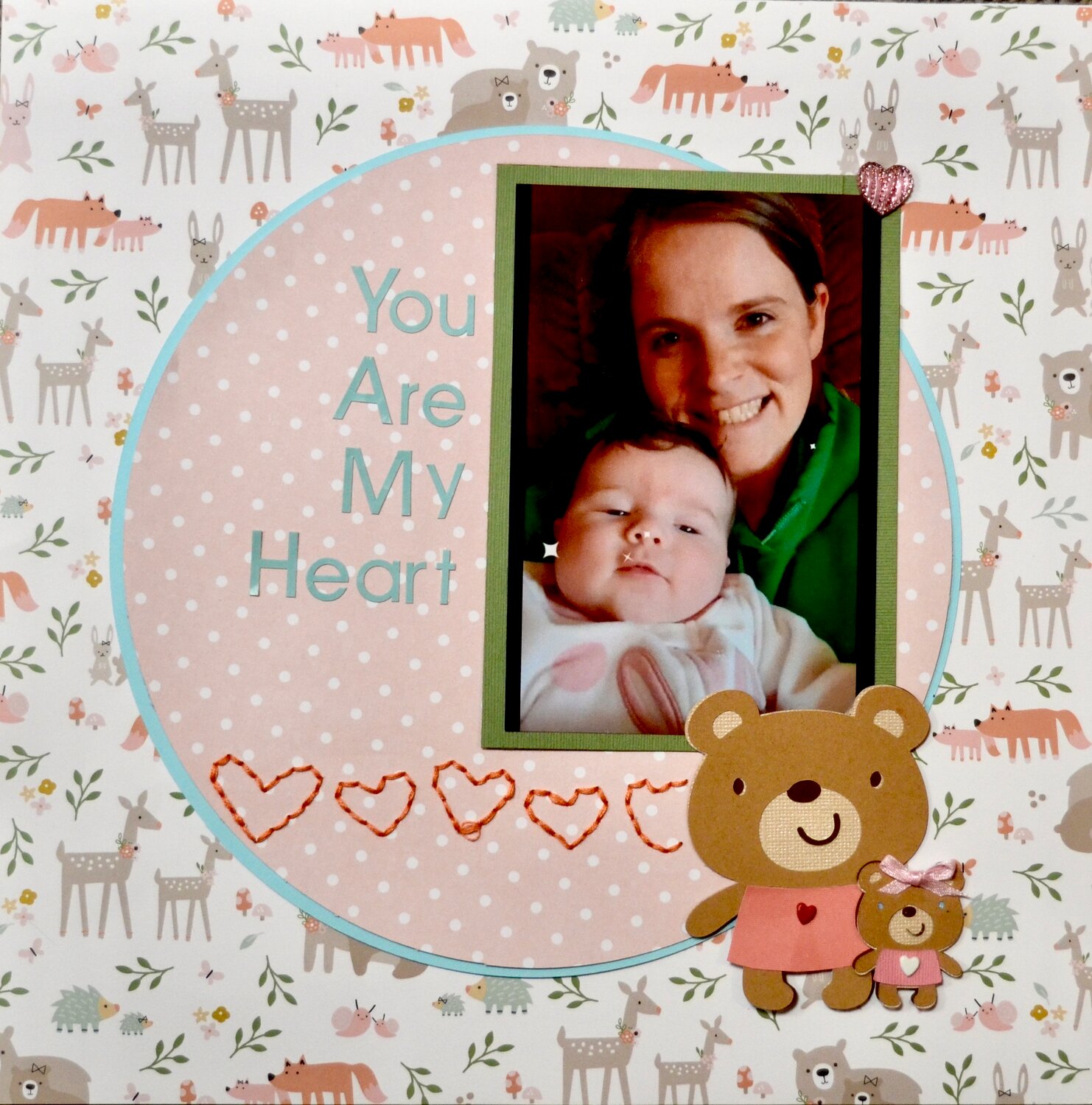 A geometric layout to show the connection between mom and baby. Handstitched hears and die cut bears with heart brads reinforce the loving feeling.