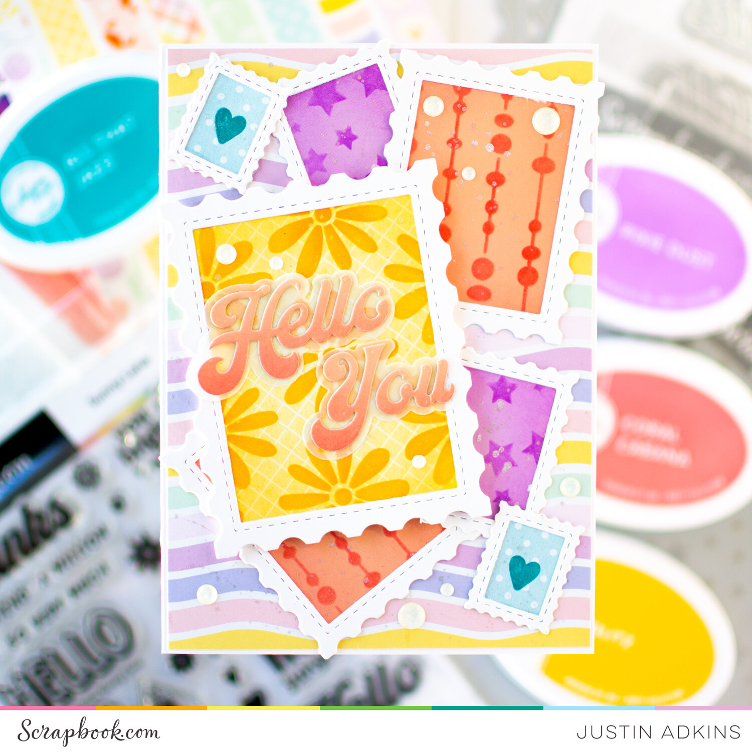 I created an A7 size card where I used Scrapbook.com Exclusive products to create a customizable postage stamp collage card! You can truly change the theme of this card for any occasion or holiday!