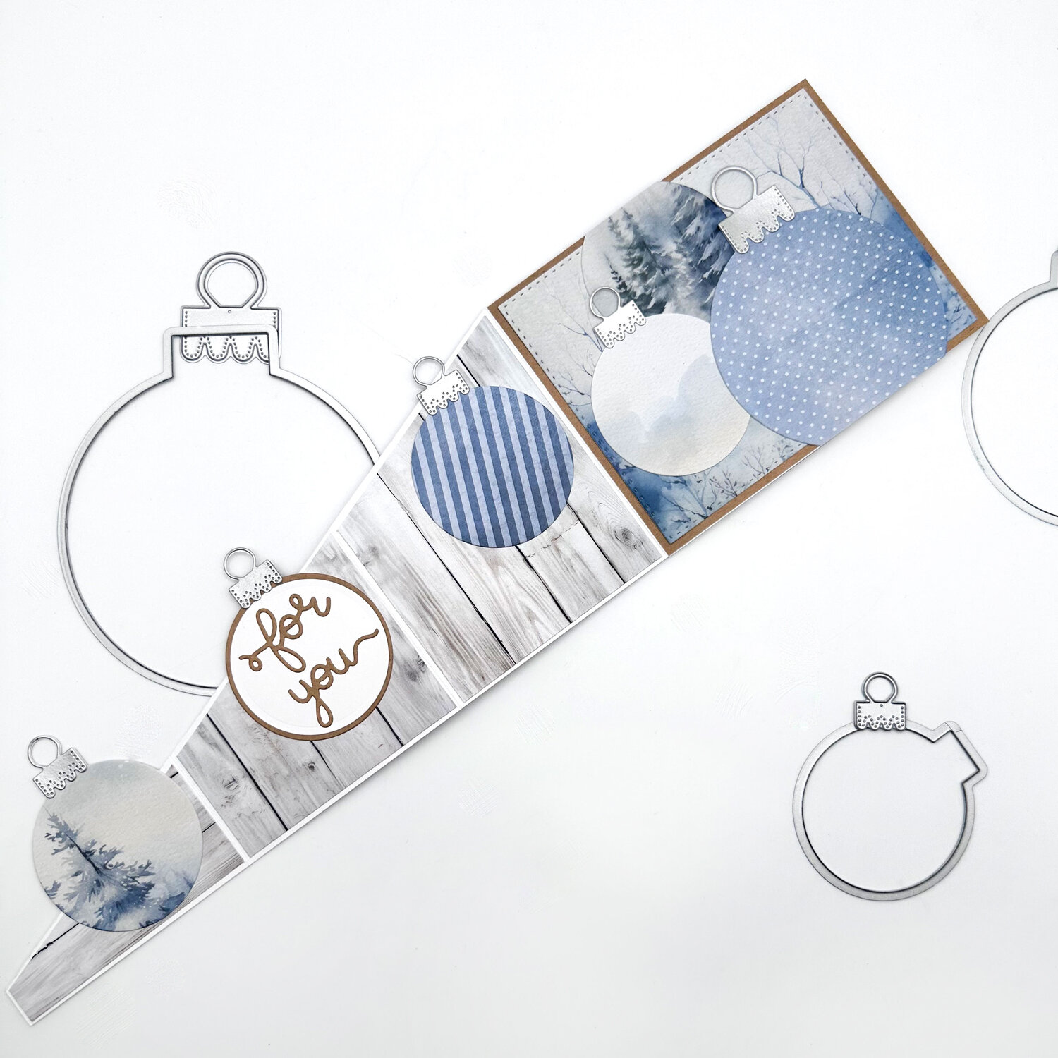 This fun fold card was created by adding a zig zag fold to the front of an A2 card base. Decorated with different sized ornaments cut out of beautiful card stock.