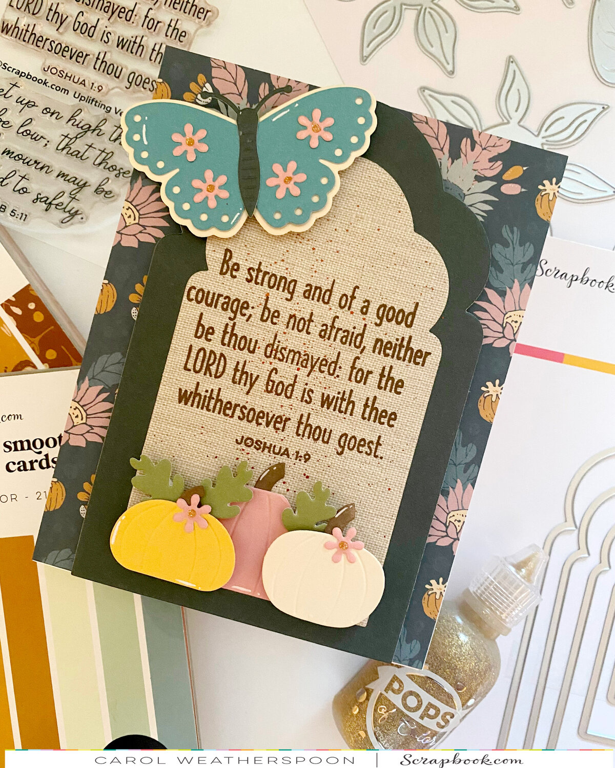 I started by adding patterned paper to my background. Next I die cut two nexted morocco dies and stamped my beautiful sentiment. Next, I die cut pumpkins, leaves and a butterfly to embellish my card.